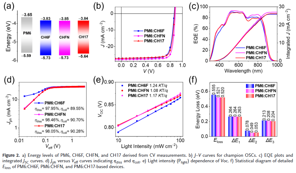 - 协同提升光电性能:CHFN基器件在开路电压(VOC)、短路电流(JSC)和填充因子(FF)上均优于对称对照器件,最终实现20.23%的高效率,且能量损失更低。