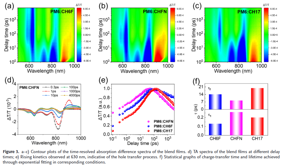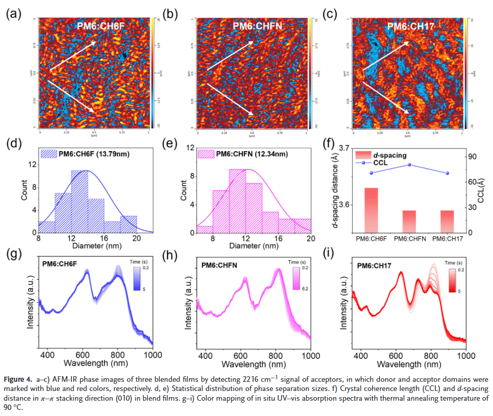 - 形貌与动力学协同优化:CHFN共混膜形成更理想的纤维状互穿网络结构,促进激子解离与电荷传输,同时具备良好的热稳定性和大面积器件适用性(1 cm²器件效率达18.09%)。