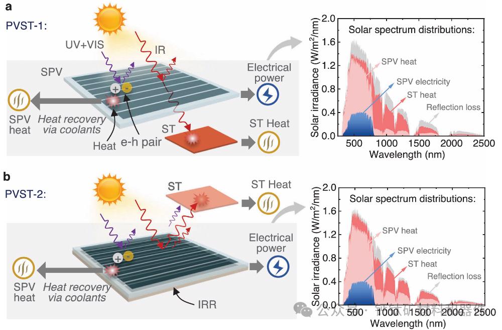 研究提出了一种基于半透明钙钛矿光伏(SPV)的混合钙钛矿光伏和太阳能热能(PVST)太阳能收集方法。这些混合PVST收集方法提供了同时进行电力和热能独立发电的解决方案,最大化太阳能的潜力。我们展示了两种混合PVST太阳能收集方法的可行性和优势。第一种方法是混合太阳能收集(PVST-1)方法,它将选择性透光的SPV与太阳能热(ST)收集器相结合,显示出电和热共发电的潜力。第二种方法是混合太阳能收集(PVST-2)方法,将SPV与红外反射器(IRR)相结合,表现出更好的性能。混合PVST-2方法的整体外部能效达到约30.0%(其中来自SPV电能的比例为13.2%,来自SPV热能的比例为2.4%,来自ST热能的比例为14.4%)。这种效率是在模仿高浓度比太阳能聚光器中ST的高温载热体热产生900°C时实现的。此外,这种外部能效有可能提高到超过40%(其中来自SPV电能的比例为24.0%,来自SPV热能的比例为1.8%,来自ST热能的比例为14.4%),假如结合当前记录效率的钙钛矿电池。进一步提高ST温度无法改善外部能效,因为这会导致热损失,消除任何潜在收益。