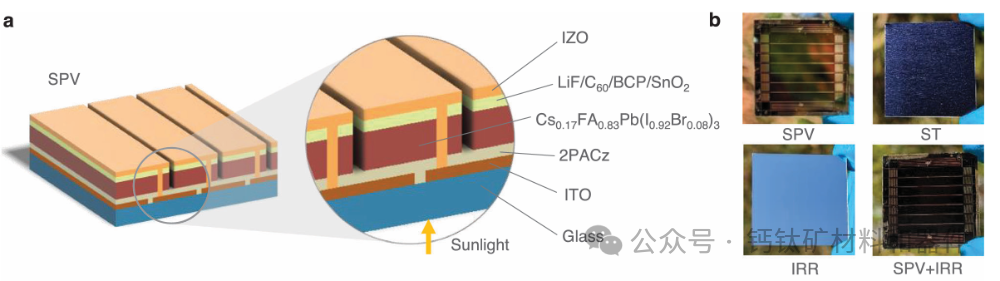 在这里,科学家提出一种使用半透明钙钛矿模块的混合太阳能收集方法的解决方案,这种模块能够有效地将高于带隙的太阳辐射能转化为电能,并选择性地将太阳光谱中的亚带隙红外光子引导至太阳能热(ST)吸收器。我们制造的宽带钙钛矿模块具有约1.6 eV的能量带隙(Eg),相比于其他类型的光伏材料如常见的硅(>1100 nm)和镓砷(>900 nm),它们能够传输或反射更大部分的红外太阳光谱(> 780 nm)到ST吸收器。这种独特的特性使它们非常适合,因为钙钛矿模块高效生成电能,而ST吸收器则吸收和利用被筛选掉的亚带隙光子,这些光子本来会被浪费。