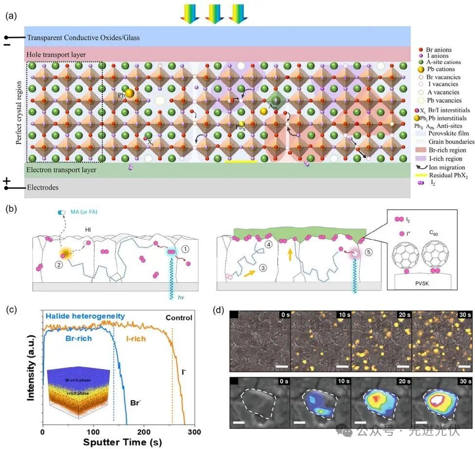 图1系统地描绘了溴基宽带隙钙钛矿太阳能电池(WBG PSC)内部复杂的缺陷生态系统,以及光照下碘物种光解引发的器件自降解链式反应。图中a部分展示了从体相到界面的各类缺陷(点缺陷、位错、晶界、析出物等)的分布,它们共同构成了一个不稳定的“缺陷生态”。b部分则通过生动的图示揭示了光致降解的恶性循环:I₂光解产生碘自由基→自由基诱导有机阳离子去质子化→生成挥发性中性物质和I⁰→I₂长程扩散→被C₆₀等传输层捕获→甚至从理想钙钛矿中光解释放出更多自由基。c和d部分通过ToF-SIMS的碘-溴深度剖面和阴极发光(CL)成像,直观证实了卤化物分布不均以及在光照下(以10秒为间隔)碘离子在晶界和特定晶面处快速聚集并发生相分离的动态过程。整张图深刻阐明了缺陷不仅是非辐射复合的中心,更是引发材料分解和性能衰退的根源。
