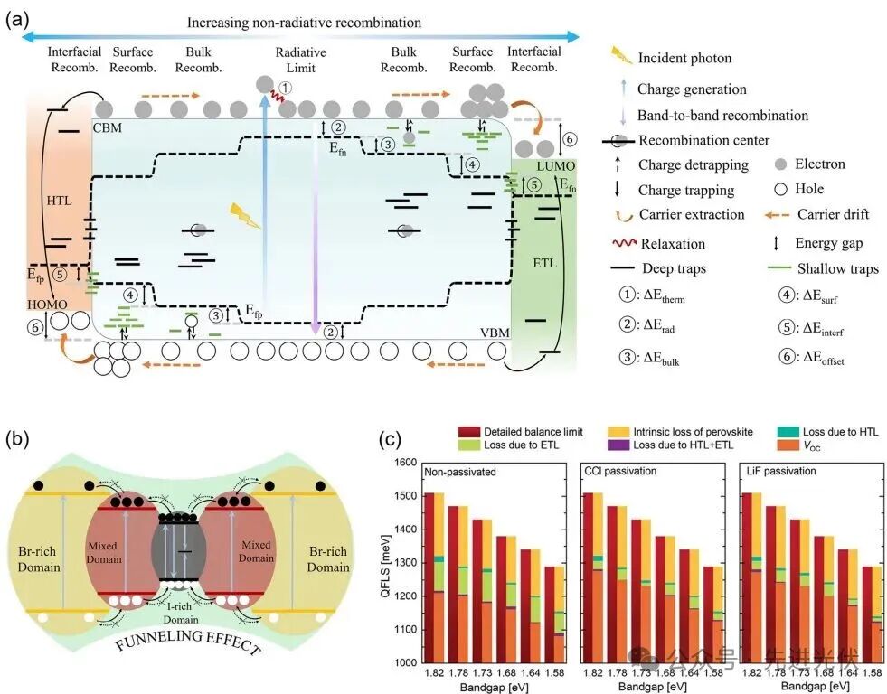 图2主要描述载流子复合与QDLS损失机理。该图从载流子动力学的角度深入分析了钙钛矿太阳能电池中开路电压(Voc)损失的微观机制。a部分示意图清晰地标出了电荷产生、传输和复合的全路径,以及它们对准费米能级分裂(QFLS)的影响,并明确指出了不同复合路径(辐射复合、SRH体复合、表面复合、界面复合)所对应的能量损失(①至⑥)。b部分特别强调了在相分离情况下,载流子会被富碘区域形成的“漏斗状”能带陷阱所捕获并复合,造成额外的Voc损失。c部分则通过实验数据对比了不同带隙钙钛矿薄膜本身以及完整电池器件(经过不同表面钝化处理)对QFLS损失的贡献,雄辩地证明了界面非辐射复合是宽禁带器件Voc损失的主要来源,而有效的钝化策略可以显著降低这部分损失。