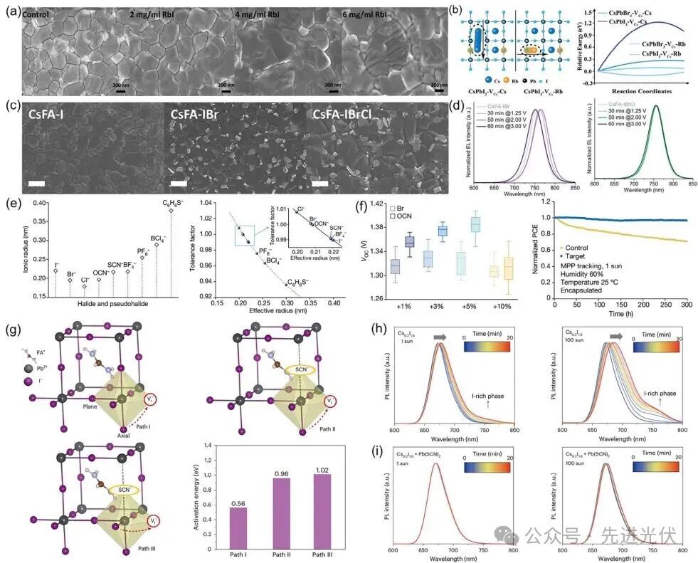 图3主要介绍组分调控与伪卤素策略。图中展示了通过组成工程(阳离子掺杂、卤素/拟卤素混合)来优化WBG钙钛矿薄膜微观结构和性能的各种策略及其效果。a部分的SEM图像清晰显示了引入RbI后,晶粒尺寸显著增大,表面变得更加致密平整。b部分的DFT计算模型和结果说明,离子半径较小的Rb⁺可以自发迁移并占据A位空位,从而有效降低缺陷态密度。c部分的SEM图对比了单卤、双卤和三卤(引入Cl)钙钛矿的形貌,证明少量Cl的添加可以大幅增加晶粒尺寸。d部分则证明了三卤器件在偏压下的卓越光谱稳定性。e和f部分介绍了拟卤素OCN⁻的部分替代,它引起了明显的晶格畸变(e),从而实现了创纪录的高Voc(1.422 V)和出色的长期运行稳定性(f)。g-i部分则聚焦于SCN⁻的作用,理论计算(g)表明SCN⁻合金化能显著提高碘离子的迁移能垒;实验数据(h,i)则证明,无论是1-sun还是100-sun光照,含SCN⁻的样品光致发光(PL)强度都稳定得多,揭示了其抑制相分离和光致降解的强大能力。