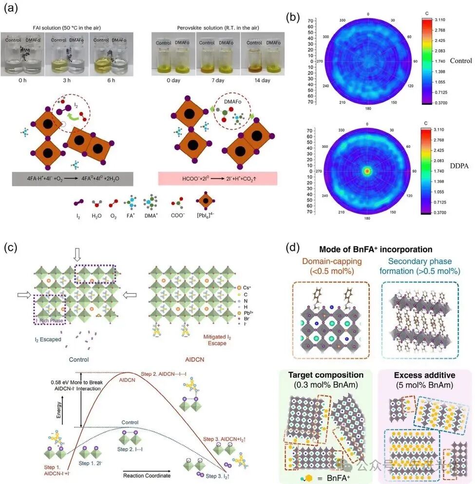 图4 重点介绍了几种关键添加剂在改善WBG钙钛矿性能和稳定性方面的独特作用机制。a部分通过样品在50°C空气中老化后的颜色变化照片,直观证明了DMAFo添加剂能有效抑制材料的氧化和还原副反应,从而提高环境稳定性。b部分的(011)晶面极图分析表明,十二烷基膦酸(DDPA)的引入能诱导晶体沿(011)方向择优生长,这有利于电荷的垂直传输。c部分的示意图和能量图则阐明,AIDCN分子既能通过化学锚定强化碘离子与晶格的结合(提高逃逸能垒),又能缓解晶格收缩,从而同时抑制卤化物相分离和碘离子逃逸,为实现高Voc(1.366 V)奠定了基础。d部分提出了有机胺添加剂BnAm与钙钛矿中FA⁺反应的两种可能模式,其产物(BnFA⁺)的分布模式(选择性钝化表面空位或形成2D相)高度依赖于添加浓度,展示了分子设计对界面调控的精细影响。