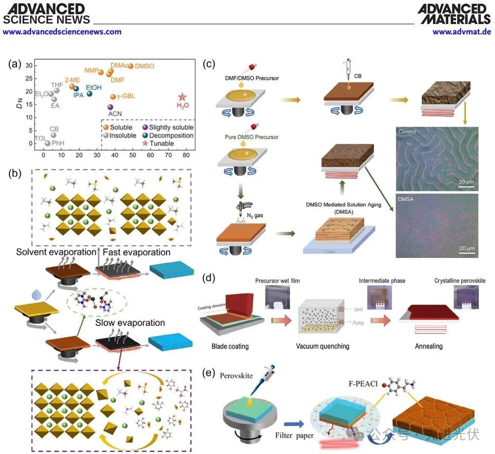 图5 总结了通过溶剂工程和制备工艺创新来控制WBG钙钛矿结晶动力学、获得高质量薄膜的策略。a图通过给出各种溶剂的给体数(DN)和介电常数(εr),为合理选择能充分溶解钙钛矿前驱体的溶剂提供了理论依据。b图示意了使用DMPU部分替代DMSO如何通过形成更稳定的中间相来延长反溶剂滴加的时间窗口,从而减缓结晶过程。c图对比了传统反溶剂淬火(DMF/DMSO)和气体淬火(纯DMSO)两种工艺制备的薄膜形貌,后者结合DMSA后处理能得到更均匀、无孔洞的薄膜。d图展示了真空抽气淬火技术用于大面积模块制造的工艺流程。e图则介绍了一种创新的“侧向密闭空间退火”技术,通过在加热板与样品之间插入浸有添加剂的滤纸,实现了在退火过程中对钙钛矿体相和表面的同步蒸汽处理与钝化。
