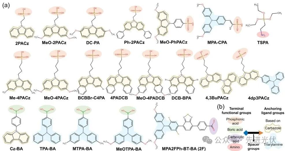 图6系统梳理了应用于WBG PSCs(尤其是p-i-n结构)中的各类自组装单分子层(SAM)空穴传输材料。a图以不同的颜色模块化地展示了已报道的SAM分子结构,使读者能快速识别其共同特征。b图则将这些SAM分子分解为三个功能部分进行概述:锚定基团(如磷酸基、羧基、硼酸基等,用于牢固连接基底)、桥连 spacer(如烷基链、共轭芳环,影响分子排列和电荷传输)和末端功能基团(如咔唑、三苯胺等衍生物,负责与钙钛矿界面相互作用并实现能级对齐)。该图指明了高性能SAM分子设计的关键在于对各部分结构的精心调配与组合。