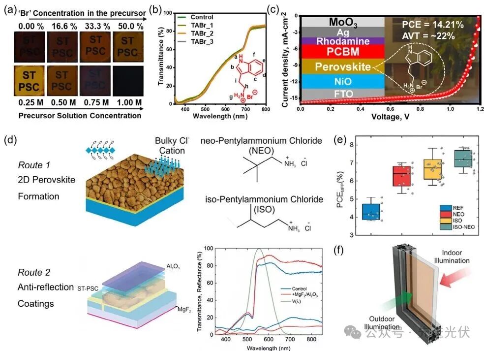 图8 展示了为实现高性能半透明光伏应用而对WBG钙钛矿器件进行的多种调控策略。a图通过不同溴含量和不同前驱体浓度制备的薄膜实物图,直观展示了通过调节组分和膜厚可以实现透光率和颜色的变化。b图的透光光谱表明,引入TABr添加剂在显著改善薄膜质量(钝化缺陷)的同时,几乎不影响其在整个可见光区的透射率,实现了光电性能与透光性的协同优化。c图给出了一个冠军半透明器件的J-V曲线和实物照片,其结构设计和14.21%的效率、3.12%的光利用效率(LUE)都标志着高性能半透明电池的实现。d-f图则介绍了一条更综合的技术路线:首先使用NEO和ISO等氯化物有机盐进行表面钝化,构建2D/3D异质结以提升Voc(d,e);随后在器件两端沉积MgF₂和Al₂O₃作为减反射涂层(ARC),最终同时提高了平均可见光透射率(AVT)和LUE(e);f图更展望了其应用于建筑一体化光伏(BIPV)窗户,进行室内外双面采光的场景。