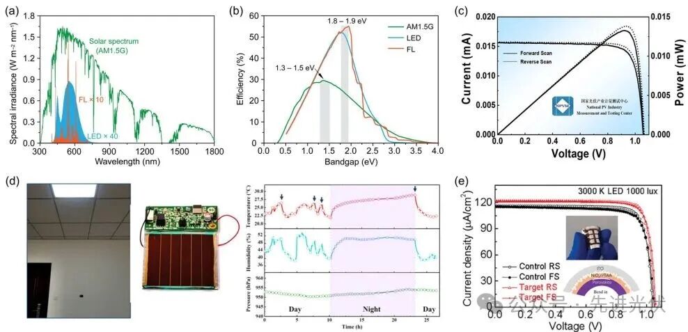 图10 阐述了宽带隙钙钛矿电池在室内光伏(IPV)应用中的巨大潜力和最新进展。a图对比了室外AM1.5G太阳光谱与室内常见光源(2700K LED和荧光灯FL)的发射光谱,清楚表明室内光光谱窄且完全位于可见光区,这与WBG钙钛矿的吸收边非常匹配。b图的理论计算(扩展的Shockley-Queisser极限)指出,在室内光下,最佳带隙移至1.8-2.0 eV,且理论效率极限远超50%,凸显了WBG材料的天然优势。c图展示了一个经过认证的室内效率高达44.72%的冠军器件的J-V曲线,证明了其现实可行性。d图描绘了一个由钙钛矿模块驱动的物联网(IoT)评估板在办公室LED照明下实时传输温湿度、压力数据的场景,展现了其实际应用价值。e图则证明了柔性IPV器件的可行性,其在1000 lux LED光照下保持了良好性能,并且经过2000次弯曲后仍能保持80%以上的效率,为可穿戴电子供电提供了可能。结论展望本综述不仅是WBG钙钛矿领域一份详尽的“工具手册”,更是指引未来突破性研究的“路线图”。它清晰表明,通过对缺陷生态系统的深刻理解和精准调控,WBG钙钛矿电池有望在下一代光电子技术中扮演核心角色。