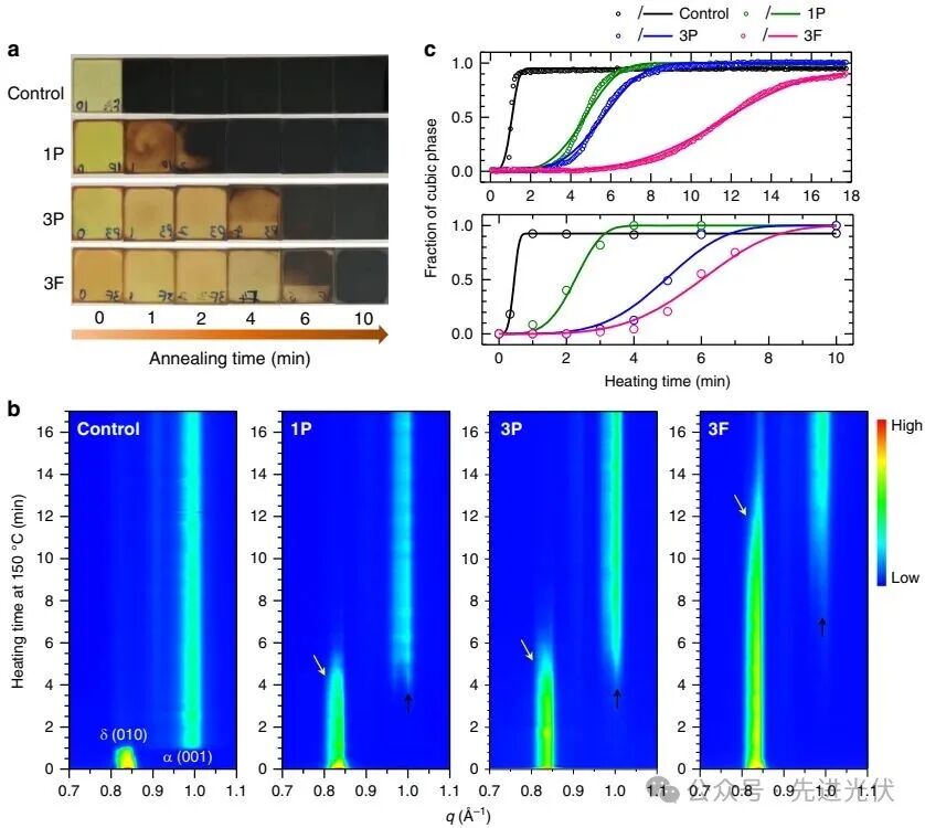 图1系统地展示了层状钙钛矿(如PEA₂PbI₄和FPEA₂PbI₄)的引入如何显著延缓甲脒基三碘化铅(FAPbI₃)从非钙钛矿相(δ相,六方,黄色)向钙钛矿相(α相,立方,黑色)的固相转化动力学过程。通过对比不同掺杂浓度和类型的层状钙钛矿(Control, 1P, 3P, 3F),图a的照片直观地显示,随着异质界面面积的增加(Control < 1P < 3P < 3F),薄膜颜色变黑(即完成相变)所需的时间从不足1分钟逐渐延长至约8分钟。图b的原位GIWAXS结果进一步定量揭示了这一动力学差异:Control样品的δ(010)衍射峰在加热1分钟后几乎突然消失,同时α(001)峰出现并保持稳定;而含有层状钙钛矿的样品,其δ相峰保留时间更长,并向α相的转化过程更为平缓。图c的等温转化图通过Johnson-Mehl-Avrami方程拟合,定量提取的速率常数k值依次减小(Control > 1P > 3P > 3F),证实层状钙钛矿的掺入显著降低了立方相的成核和/或生长速率。此外,GIWAXS峰形的演变(图b中黄色和黑色箭头所指)表明,异质界面的引入导致了晶格应变的存在,改变了相转化的能垒和路径。