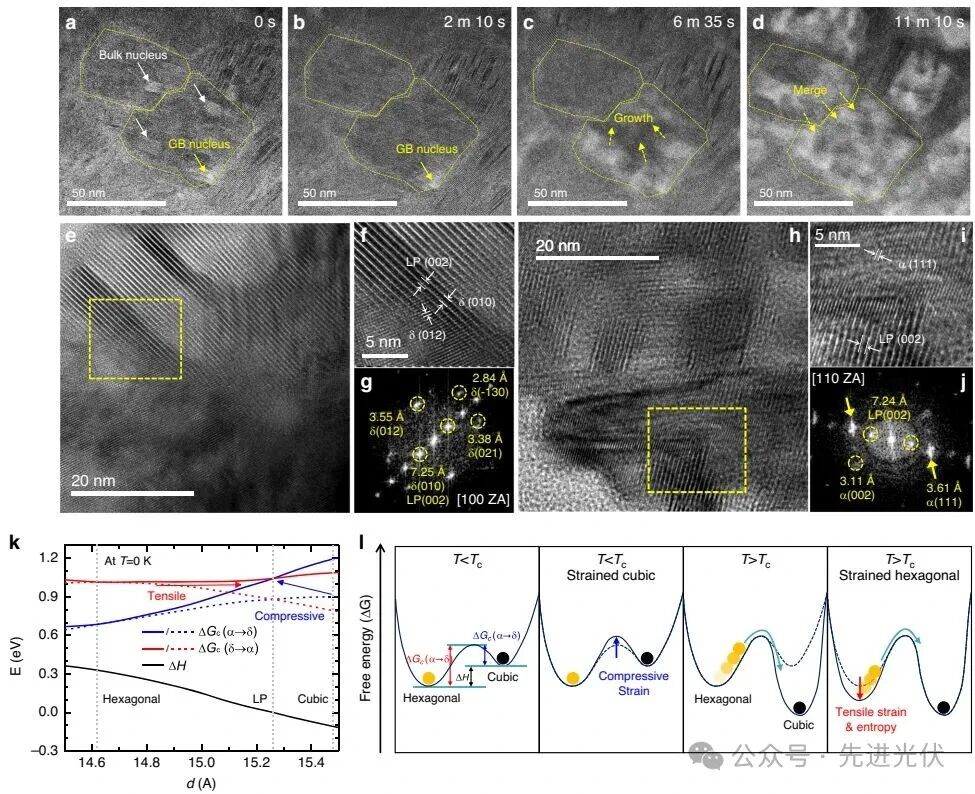 图2结合原位透射电镜(TEM)观察和第一性原理计算(DFT),深入揭示了纳米异质外延(NHE)的生长机制和热力学根源。图a-d的原位TEM图像显示,在加热过程中,立方相晶核(亮斑)同时出现在晶粒内部和边界,但体相晶核很快重新溶解,而位于晶界处的晶核则缓慢地向晶粒内部生长,最终导致相邻晶粒可能发生合并。图e-j的高分辨TEM及FFT分析表明,在相变前,层状钙钛矿的(002)晶面与δ-FAPbI₃的(010)晶面在界面处对齐,并观测到δ-FAPbI₃的晶面间距增大(7.25 Å vs. 体相的7.11 Å),表明存在拉伸应变;相变后,生长的α-FAPbI₃的(111)晶面与层状钙钛矿的(002)晶面取向对齐,但其晶面间距略小(3.61 Å vs. 体相的3.65-3.71 Å),表明存在压缩应变,证实了异质外延生长。图k,l的DFT计算从机理上阐明,应变和熵的协同效应共同调控了相转化能垒:拉伸应变增加了六方相的稳定性(通过降低FA⁺阳离子的旋转势垒,增加其熵贡献),而压缩应变则提高了立方相的热力学稳定性(通过提高立方相向六方相转化的能垒),从而协同导致了相变动力学的延缓。