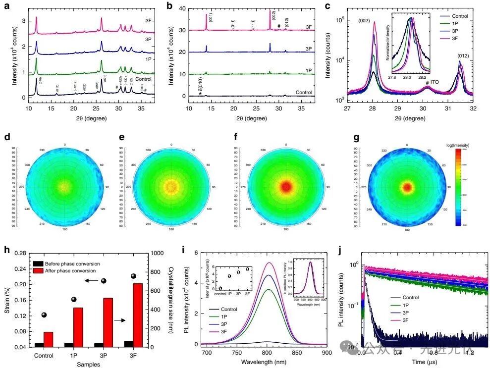 图3全面展示了纳米异质外延(NHE)策略对FAPbI₃薄膜晶体质量和光电性能的显著改善。图a,b的XRD结果显示,相变前所有薄膜的衍射峰强度无明显差异,表明层状钙钛矿的加入并未显著改变δ相的结晶过程;然而,相变后α-FAPbI₃的(001)和(002)衍射峰强度随NHE的增强(Control < 1P < 3P < 3F)而系统性增强。图c的高分辨XRD进一步显示,(002)峰的半高宽逐渐减小且向高角度移动,表明晶粒尺寸增大并存在压缩应变。图d-g的极图测量直观地证实,NHE诱导了强烈的(001)择优取向(信号强度在圆心处更集中)。图h定量总结了相变前薄膜的应变与相变动力学密切相关,且相变后晶粒尺寸实现了近10倍的增大(从~40-65 nm增大至~400-675 nm)。优异的晶体质量直接转化为了卓越的光电性能:图i的稳态PL强度提升了超过30倍(从0.16×10⁶ 到 5.34×10⁶),且吸收边和峰位不变,表明带隙未变但非辐射复合被有效抑制;图j的时间分辨PL显示,快组分(τ₁, 源于缺陷辅助复合)的比例显著降低(从39.1%降至13.4%),而慢组分(τ₂, 源于双分子辐射复合)的寿命大幅延长(从32.0 ns增至1862.1 ns),证实缺陷密度显著降低,载流子寿命极大延长。