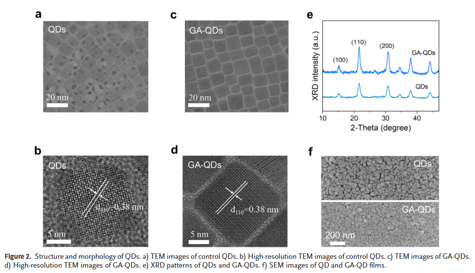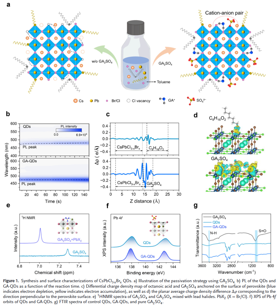本文郑州大学姚纪松和宋继中等人提出了一种阳离子-阴离子对辅助合成策略,用于制备高质量的CsPbCl₃₋ₓBrₓ QDs。在合成过程中引入硫酸胍(GA₂SO₄),其中硫酸根阴离子钝化了配位不足的Pb²⁺缺陷,有效减少了非辐射复合;而胍阳离子通过氢键与QD表面的卤素离子相互作用,抑制了Cl空位缺陷的形成。得益于这种阳离子-阴离子对的协同钝化效应,QDs的光致发光量子产率从42%提升至86%。同时,QDs表现出高结晶质量,有利于载流子传输。最终,基于该QDs的QLED在470 nm波长下实现了24.9%的外量子效率,比对照组器件提高了1.6倍。