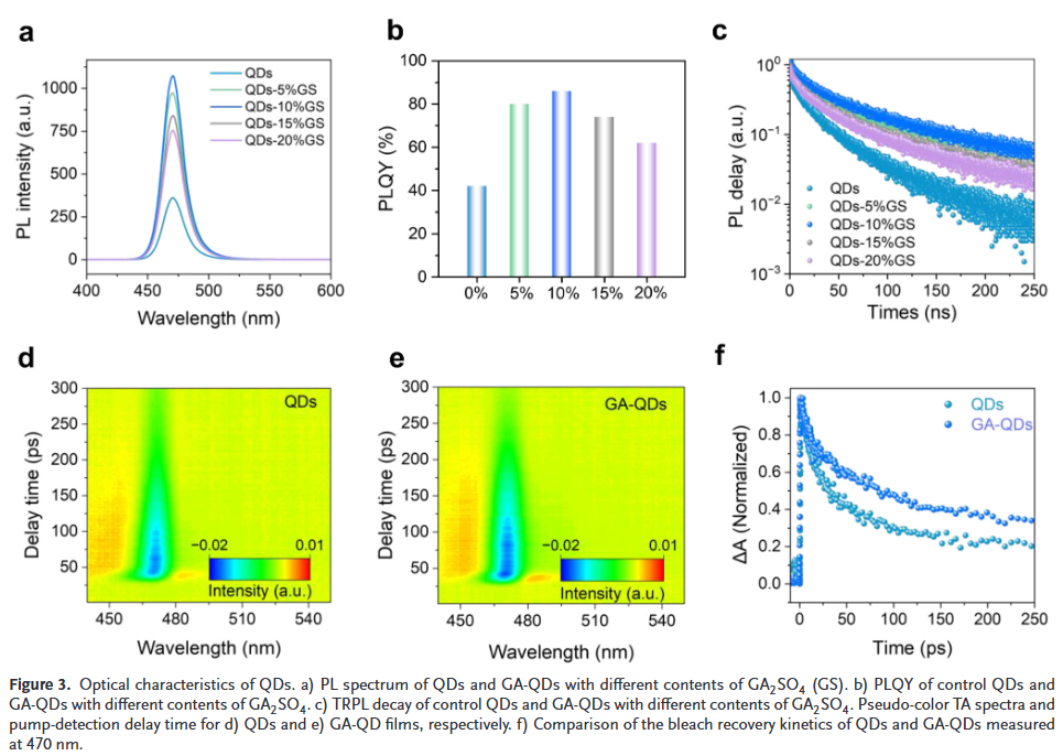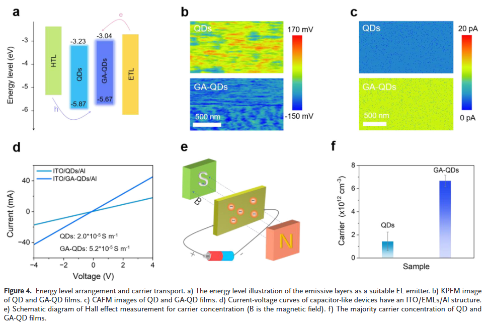- 光电性能全面提升:优化后的QDs光致发光量子产率提升至86%,载流子迁移率显著提高,薄膜导电性增强2.6倍,器件开启电压降低至2.2V。