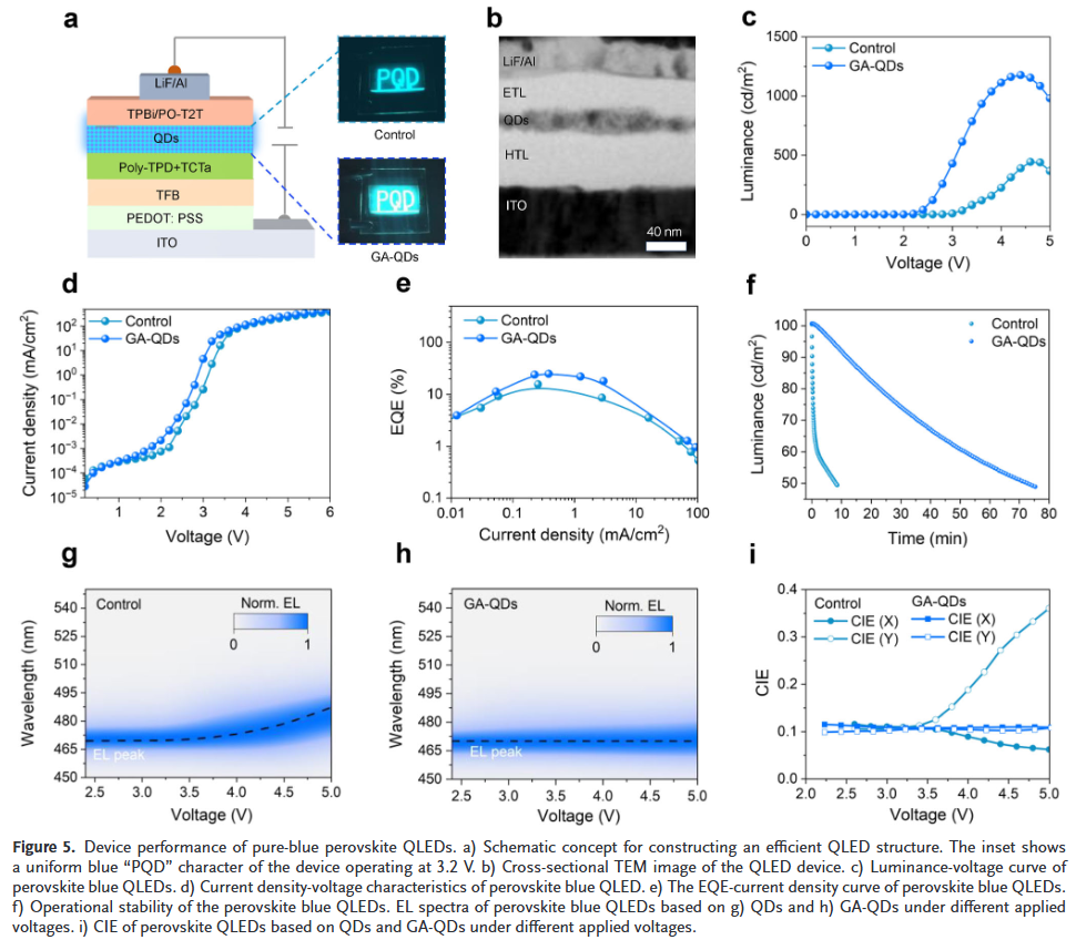 - 纯蓝光QLED性能创纪录:在470 nm波长下实现24.9%的EQE和1176 cd/m²的亮度,光谱稳定性显著提升,电压驱动下无光谱偏移,器件寿命提升9.6倍。