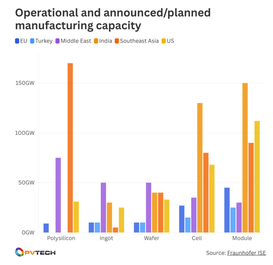 然而,若将截至 2030 年已宣布或计划的产能计算在内,这一数字会高得多,如下图所示。即便如此,欧盟在组件产能方面仍落后于其他地区,尤其是美国、印度和东南亚。