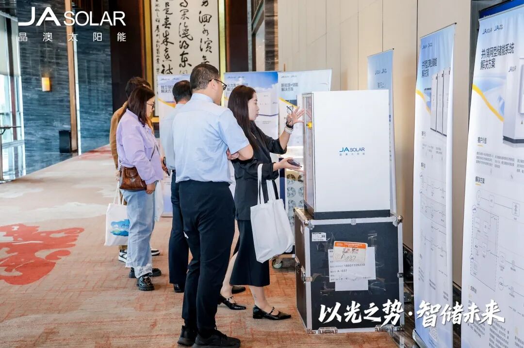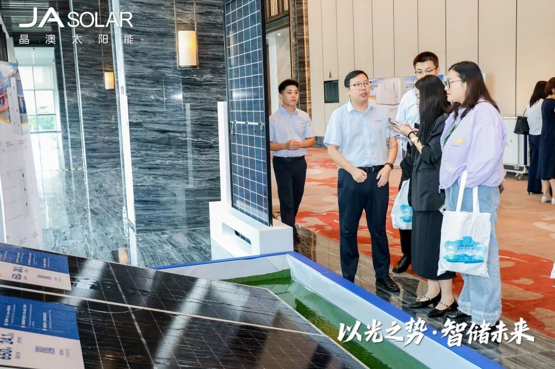 论坛现场,晶澳科技带来了防积灰组件、复合边框组件与储能系统实物展示,直观呈现产品优势。晶澳科技产品部长重点介绍了面向中国分销市场的组件全场景应用解决方案,晶澳科技储能BU副总裁付海明分享了公司在光储融合新格局下的实践成果,展现了面向中小型工商业场景的六大储能解决方案。