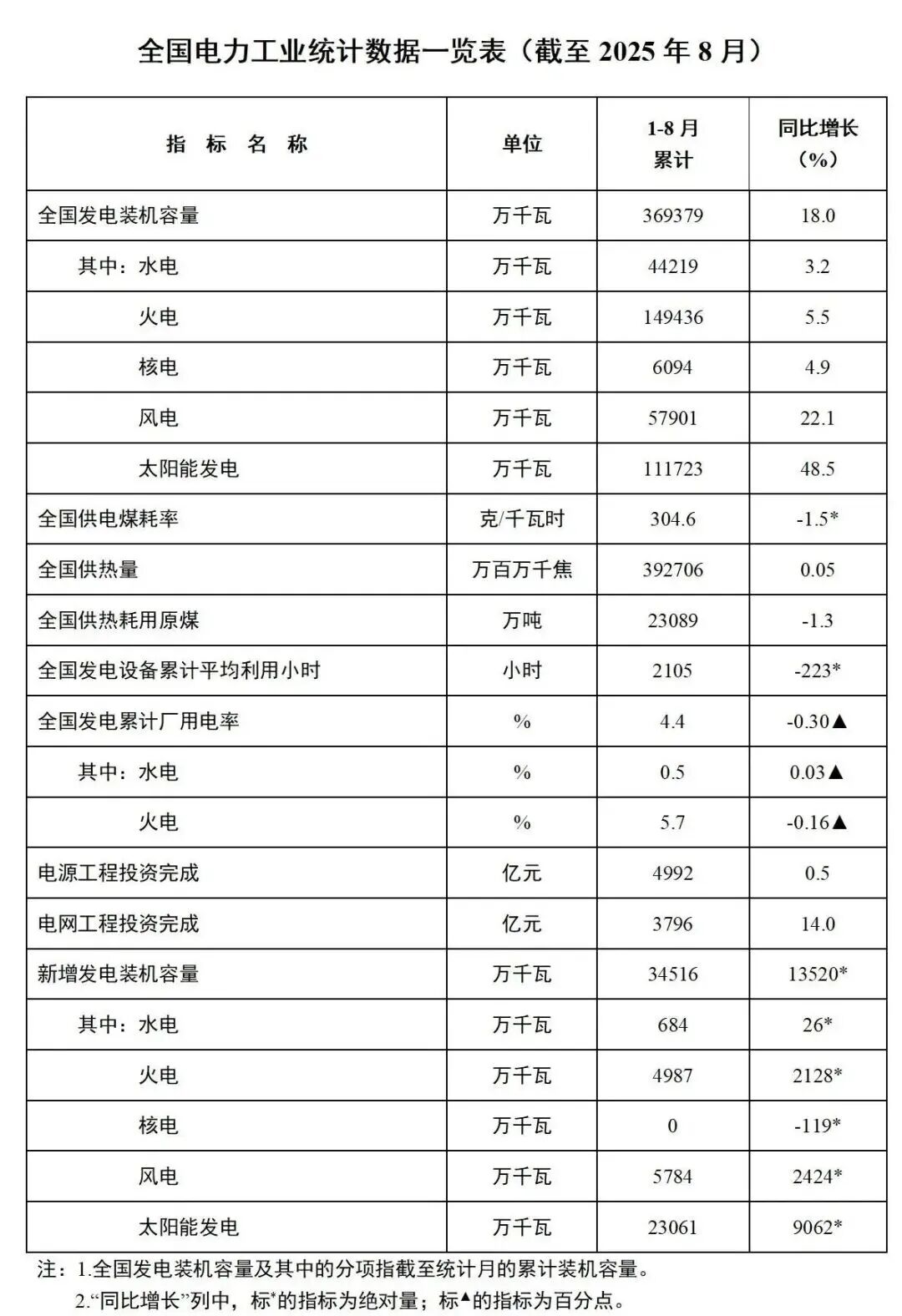 根据发布内容,截至8月底,全国累计发电装机容量为36.9亿千瓦,同比增长18.0%。其中,太阳能发电装机容量为11.2亿千瓦,同比增长48.5%;风电装机容量为5.8亿千瓦,同比增长22.1%。1~8月份,全国发电设备累计平均利用2105小时,比上年同期降低223小时。