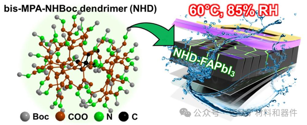 bis-MPA-NHBoc树枝状聚合物(NHD)和NHD-FAPbI3钙钛矿太阳能电池(NHD-PSC)结构的分子结构。图片来源:先进材料