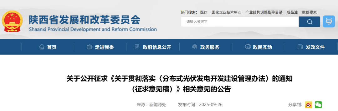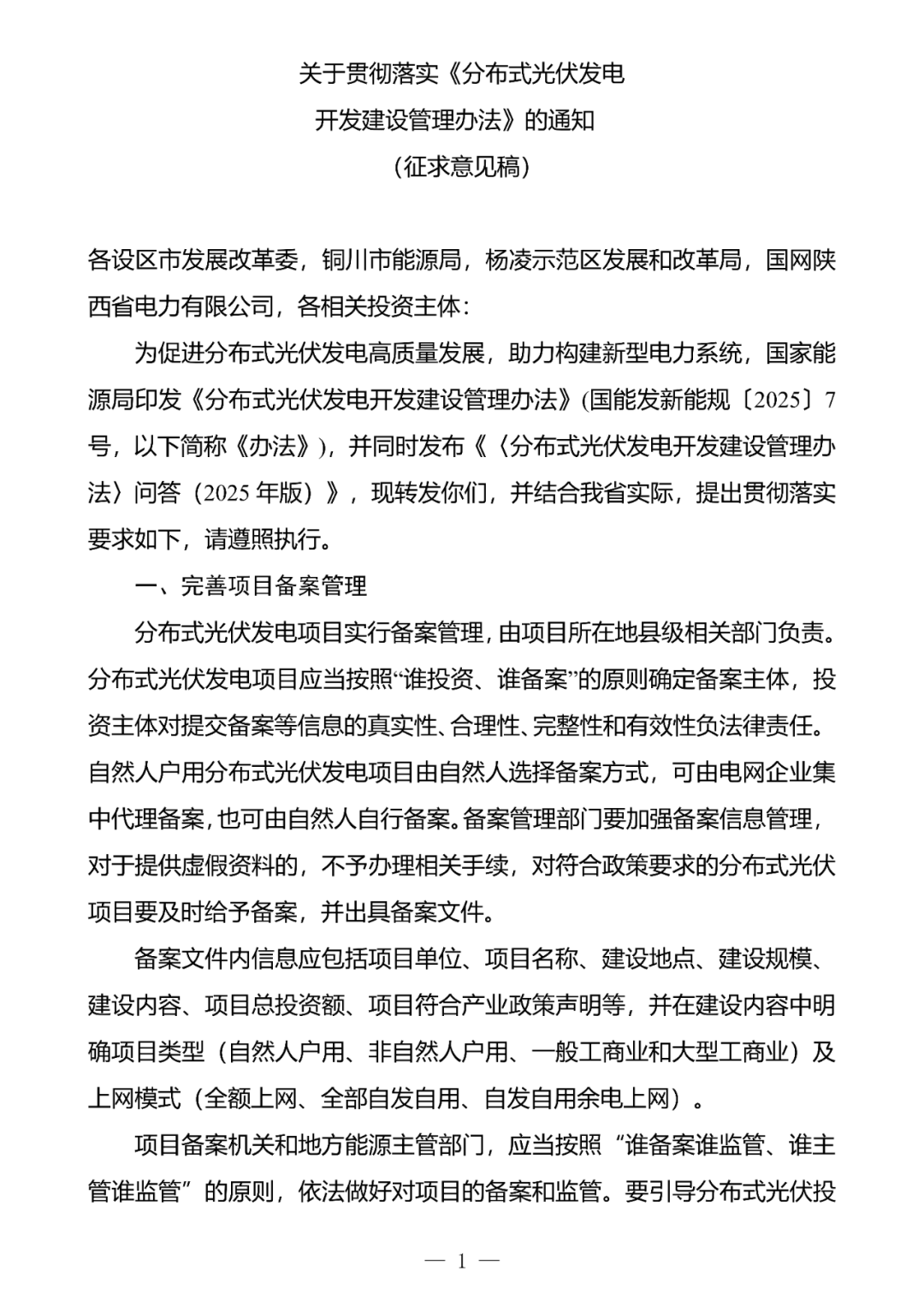 公开征求意见时间截止到2025年9月30日,请将意见建议电子版发送至邮箱fgwxnyc@shaanxi.gov.cn,邮件主题为“姓名(或单位)+关于贯彻落实《分布式光伏发电开发建设管理办法〉的通知(征求意见稿)建议”。纸质信件:邮寄至陕西省西安市新城大院29号楼318室(邮编:710006)。