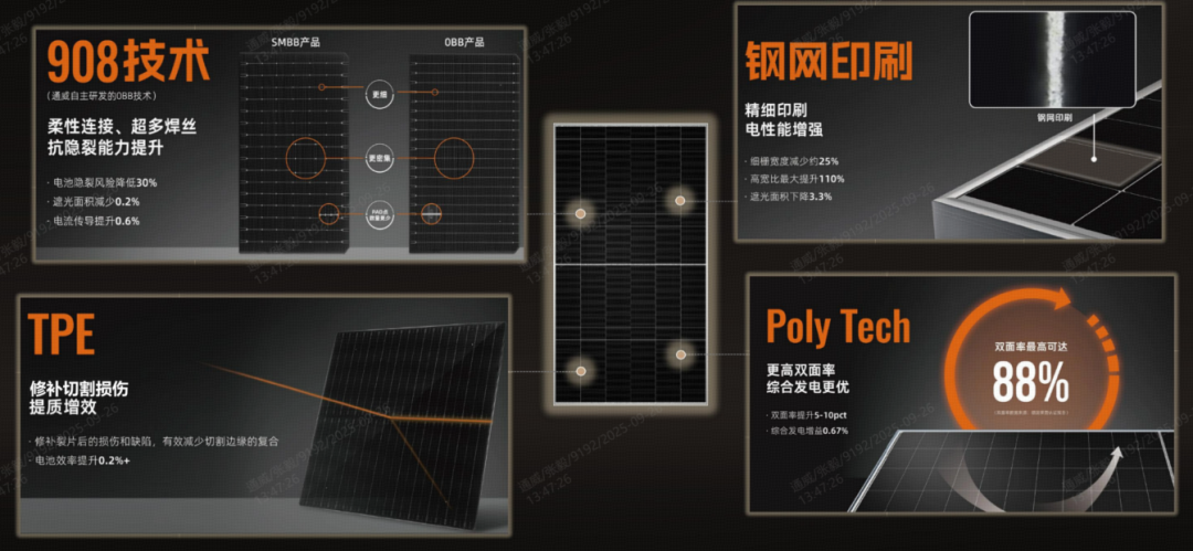 当前,光伏行业正经历周期性调整,面临阶段性供需压力和竞争挑战。越是关键时刻,越需要坚定信心,以技术创新驱动行业持续进步,实现高质量发展。通威推出并大规模量产的TNC 2.0高效组件,正是应对新阶段挑战、满足未来市场需求的有力武器。TNC 2.0组件基于908、TPE、钢网印刷、Poly Tech等四大核心工艺,实现了组件功率、转换效率的显著提升和碳足迹的有效降低,为电站带来更高的单位面积发电量和更低的全生命周期度电成本,是支撑36亿千瓦目标如期甚至提前实现的坚实技术保障。在生产制造环节通威贯彻绿色发展理念,碳足迹值处于行业领先水平,积极响应全球绿色供应链要求。