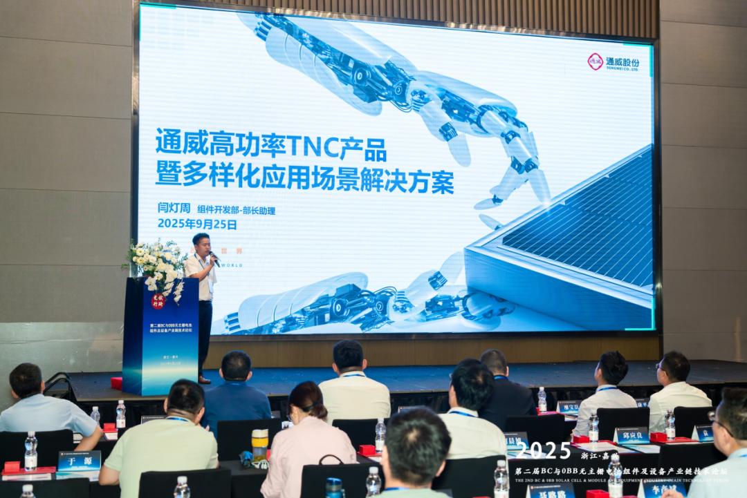 在题为《通威高功率TNC产品暨多样化应用场景解决方案》的主题演讲中展示了通威的最新研发成果。通威自2020年开始布局研发TOPCon,建成了行业首条210 PECVD Poly电池中试线,2025年重磅推出TNC 2.0产品,领先的技术实力让通威在N型时代站立潮头。0BB技术作为高效产品的基石,通威量产组件已经达到645W+,不久的将来,650W、660W、670W也触手可及,辅以双面率优势,通威TNC2.0产品具备较强的市场竞争力。