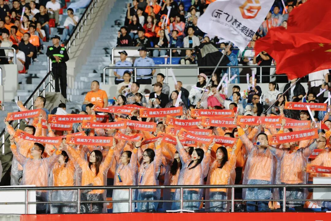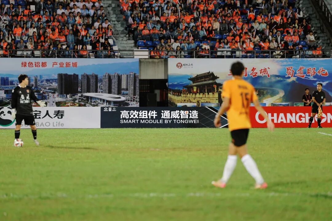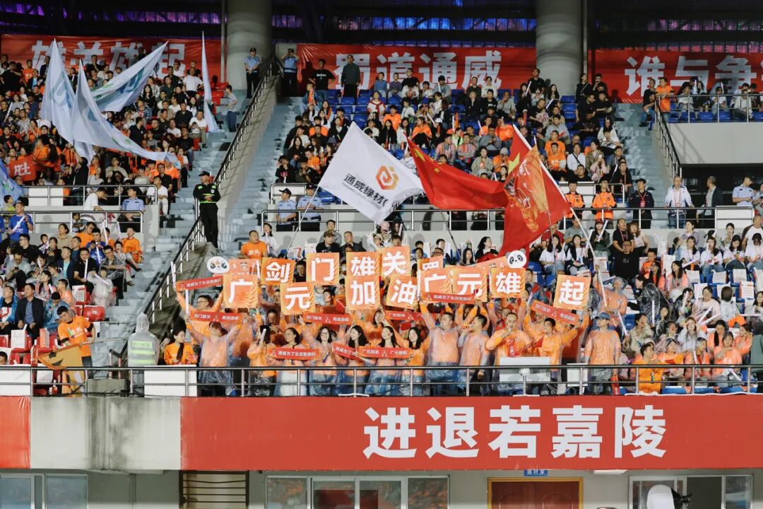 比赛现场,通威元素随处可见,从场边的宣传展示板到助威团的专属标识再到比赛现场的实时大屏幕,通威的品牌形象与足球赛事的活力氛围深度融合,让现场两万余名观众对通威的品牌理念有了更直观的感受。足球场上所展现的拼搏进取、团队协作精神,正是通威所倡导的核心价值,“追求卓越、奉献社会”不仅是一句口号,更是每一名员工在岗位上的具体行动,“实力代表尊严”也不仅是赛场上的铁律,更是通威人在技术研发、生产运营中不断超越自我的内在动力。