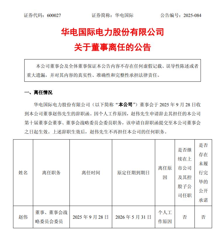 9月28日,华电国际发布关于董事离任的公告。董事会于 2025 年 9 月 28 日收到本公司董事赵伟先生的辞职函。因个人工作原因,赵伟先生申请辞去其担任的本公司第十届董事会董事、董事会战略委员会委员职务,该申请自辞职函提交至本公司董事会之日起生效。上述辞职生效后,赵伟先生不再担任本公司的任何职务。