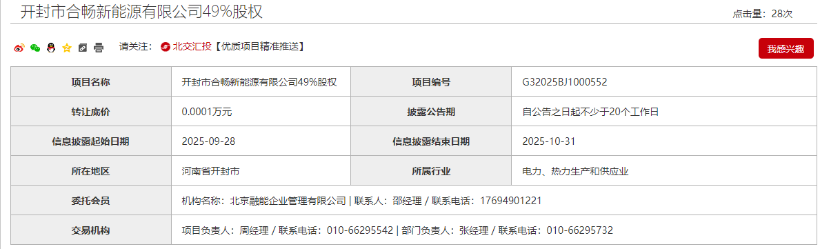 9月28日,中国三峡新能源(集团)股份有限公司转让开封市合畅新能源有限公司49%股权,转让底价0.0001万元。