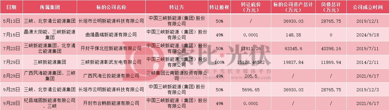 索比光伏网发现,年初至今,三峡新能源已陆续转让至少7家新能源公司股权: