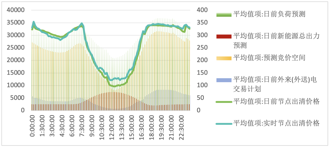 分析1月-4月历史供需数据,4月份每日全省负荷相对前1-3月份较低,4月10日午间时段日前负荷远低于历史均值30198MW,新能源出力午间在8000-9000MW,因此判断午间时段日前电价偏低。
