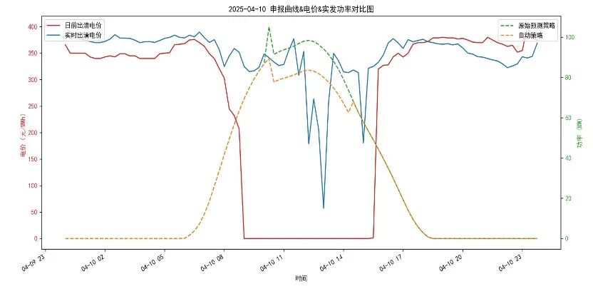 根据市场供需、气象预测、历史电价走势等因素后台算法自动判断日前出清电价整体低于实时出清电价,午间时段现货价差方向为负价差,午间价差空间相对早晚高峰价差空间较大,因此,选择在10:15-14:30之间压低日前短期曲线。最终。在4月10日当日实现现货增收。