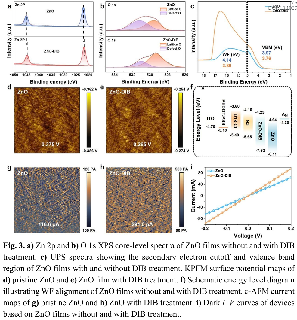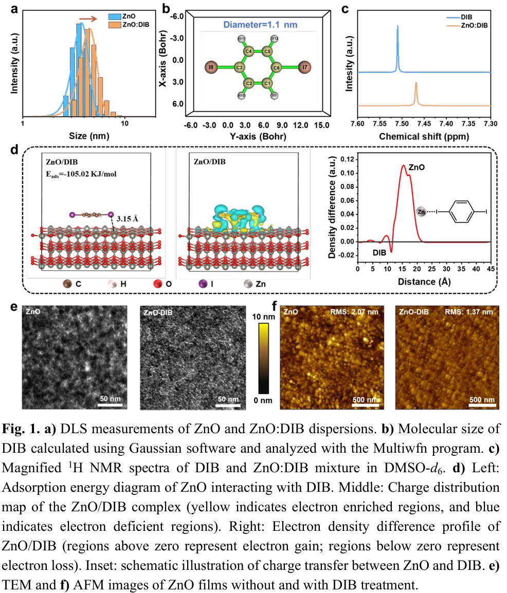 - 提出固体添加剂诱导ZnO定向附着新策略:利用挥发性固体添加剂DIB在成膜和热处理过程中调控ZnO纳米颗粒的堆叠行为,实现结构有序与缺陷钝化的协同提升。