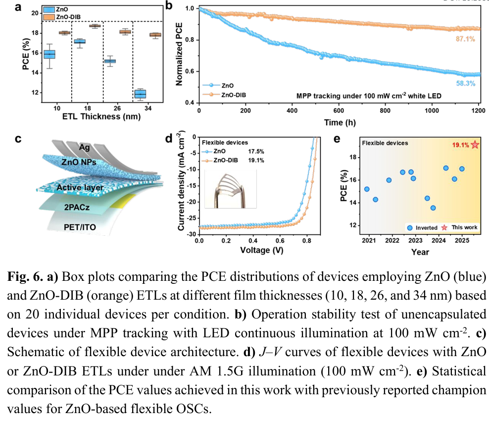 - 具备优异厚度容忍度与稳定性:ZnO-DIB器件在10–35 nm厚度范围内效率波动<5%,并在连续光照下保持超过80%的初始效率。