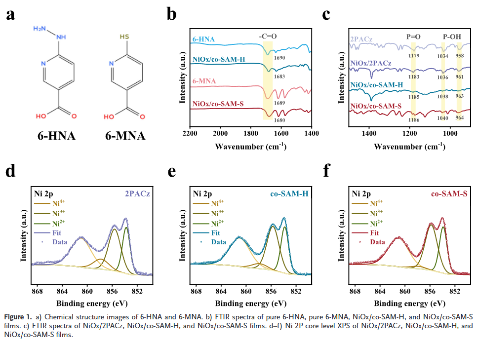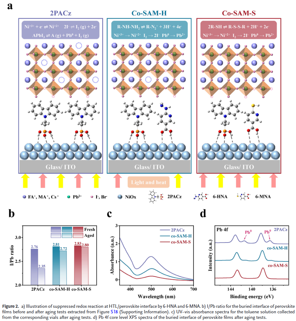 - 共自组装策略提升界面稳定性:通过引入6-HNA与6-MNA分子,有效抑制NiOx/钙钛矿界面的氧化还原反应,减少Ni⁴⁺、Pb⁰和I⁰等有害物种的生成。