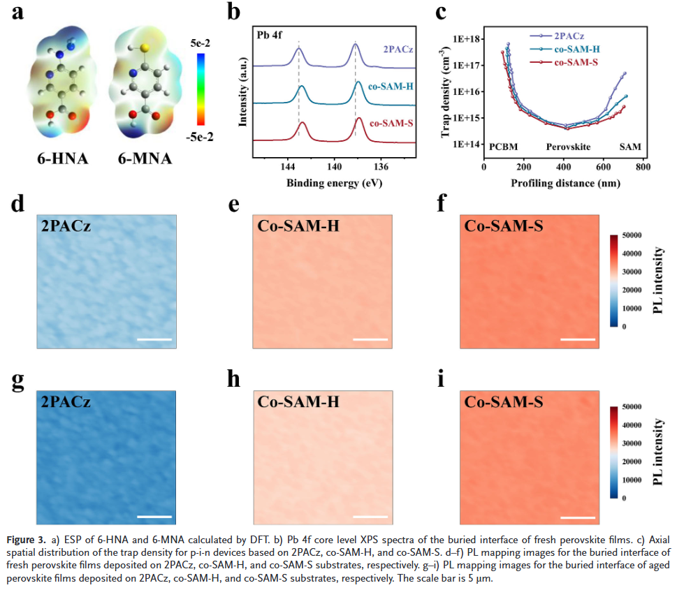 - 多功能分子设计:6-MNA分子兼具分散SAM、钝化Pb²⁺缺陷与调节能级对齐的功能,实现界面物理隔离与化学钝化的协同增强。