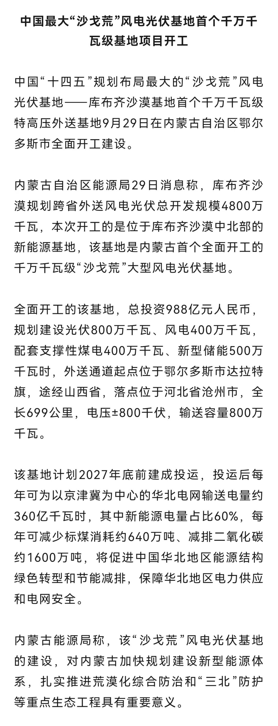 记者从内蒙古能源局获悉,9月29日,库布齐中北部新能源基地特高压外送通道开工建设,标志着我国“十四五”规划布局的最大“沙戈荒”风电光伏基地——库布齐沙漠首个千万千瓦级特高压外送基地全面开工。工程投运后,每年可向京津冀地区输送电量约360亿千瓦时,其中新能源电量占比60%,相当于减少标煤消耗约640万吨、减排二氧化碳约1600万吨。