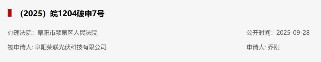 近日,阜阳荣联光伏科技有限公司被自然人乔刚向安徽省阜阳市颍泉区人民法院申请破产,案号为(2025)皖1204破申7号。