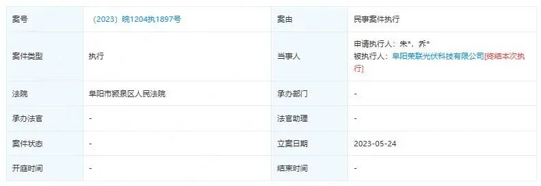 据企查查信息显示,阜阳荣联光伏科技有限公司(下称 “阜阳荣联光伏”)早在2023年5月,就疑似与此次破产申请人乔刚存在民事案件。