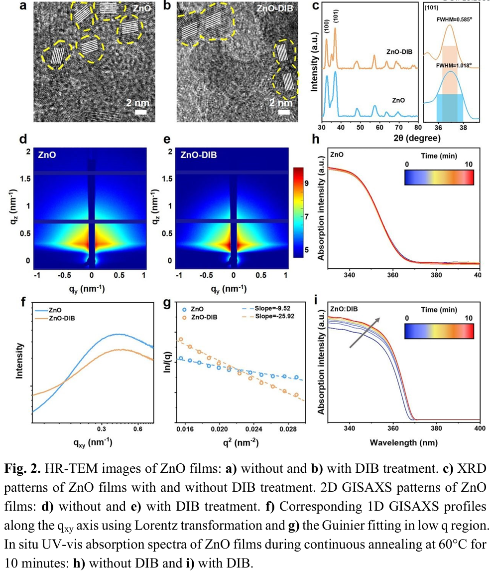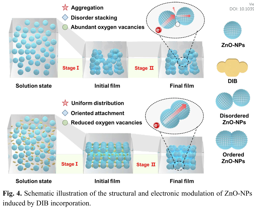 - 提出固体添加剂诱导ZnO定向附着新策略:利用挥发性固体添加剂DIB在成膜和热处理过程中调控ZnO纳米颗粒的堆叠行为,实现结构有序与缺陷钝化的协同提升。