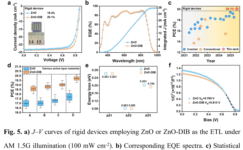 - 实现传统结构OSC效率突破:刚性器件效率达20.1%,柔性器件达19.1%,均为ZnO基ETL器件的最高纪录。