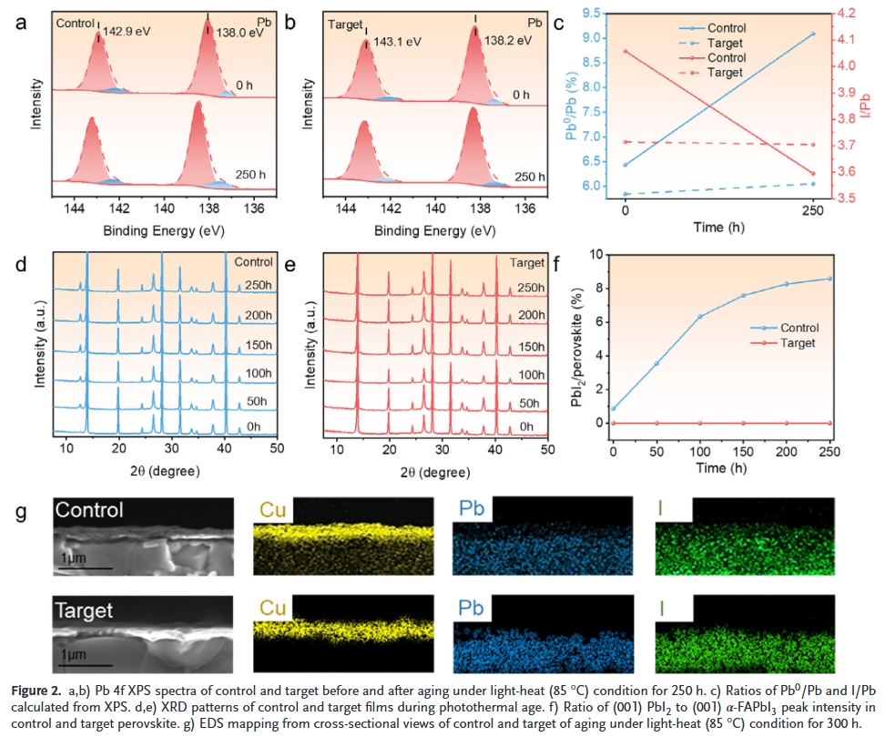 - 卓越的光热稳定性:在85°C高温下连续运行1000小时后,器件效率仍保持92.5%,远优于对照组(43.8%),展现出强健的实用化潜力。