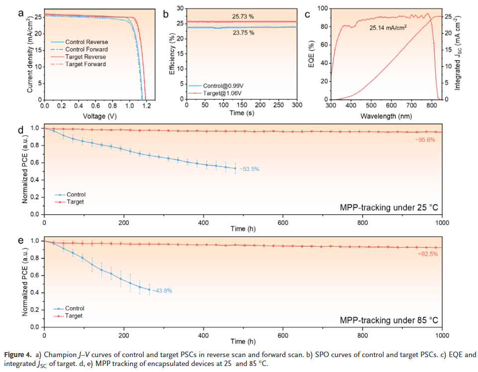 最终,目标PSCs实现了26.23%的冠军效率,并在85°C下持续最大功率点跟踪1000小时后仍保持92.5%的初始效率,展现出优异的运行稳定性。