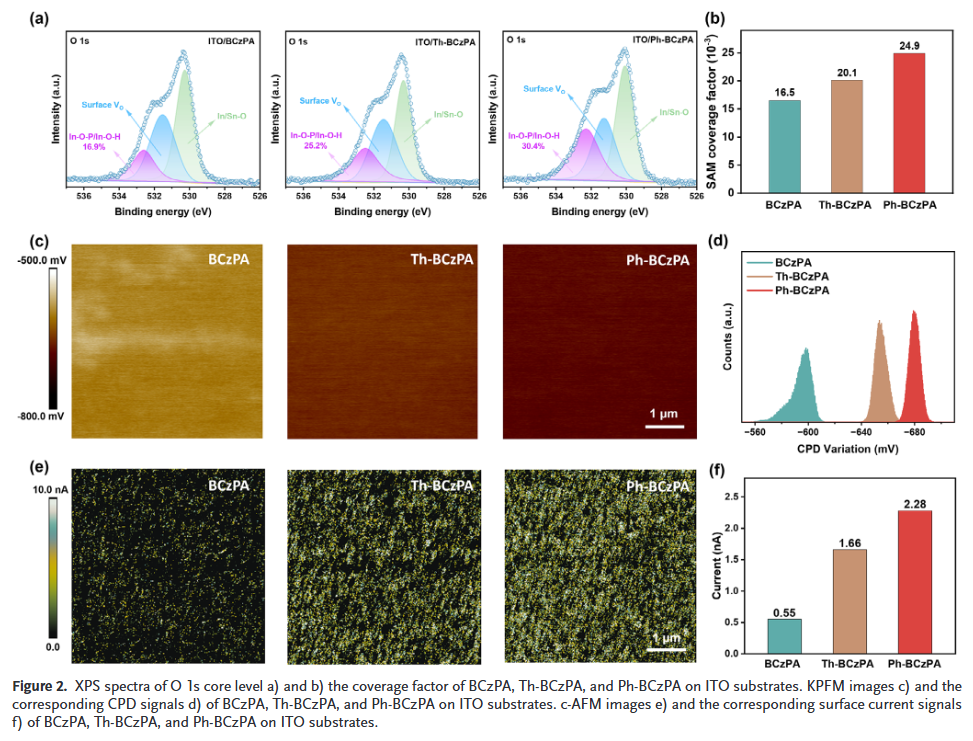 - 二聚SAMs设计实现高均匀性与强锚定:通过苯基/噻吩基桥联构建二聚SAMs(Ph-BC2PA/Th-BC2PA),有效抑制分子聚集,形成均匀致密的空穴传输层,并显著增强在ITO表面的锚定能。