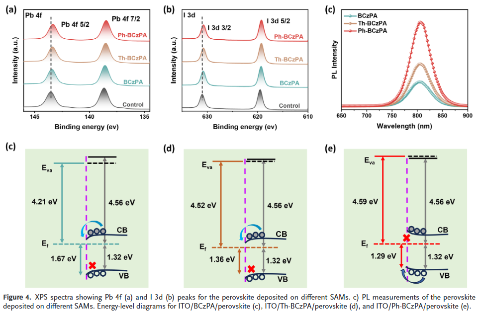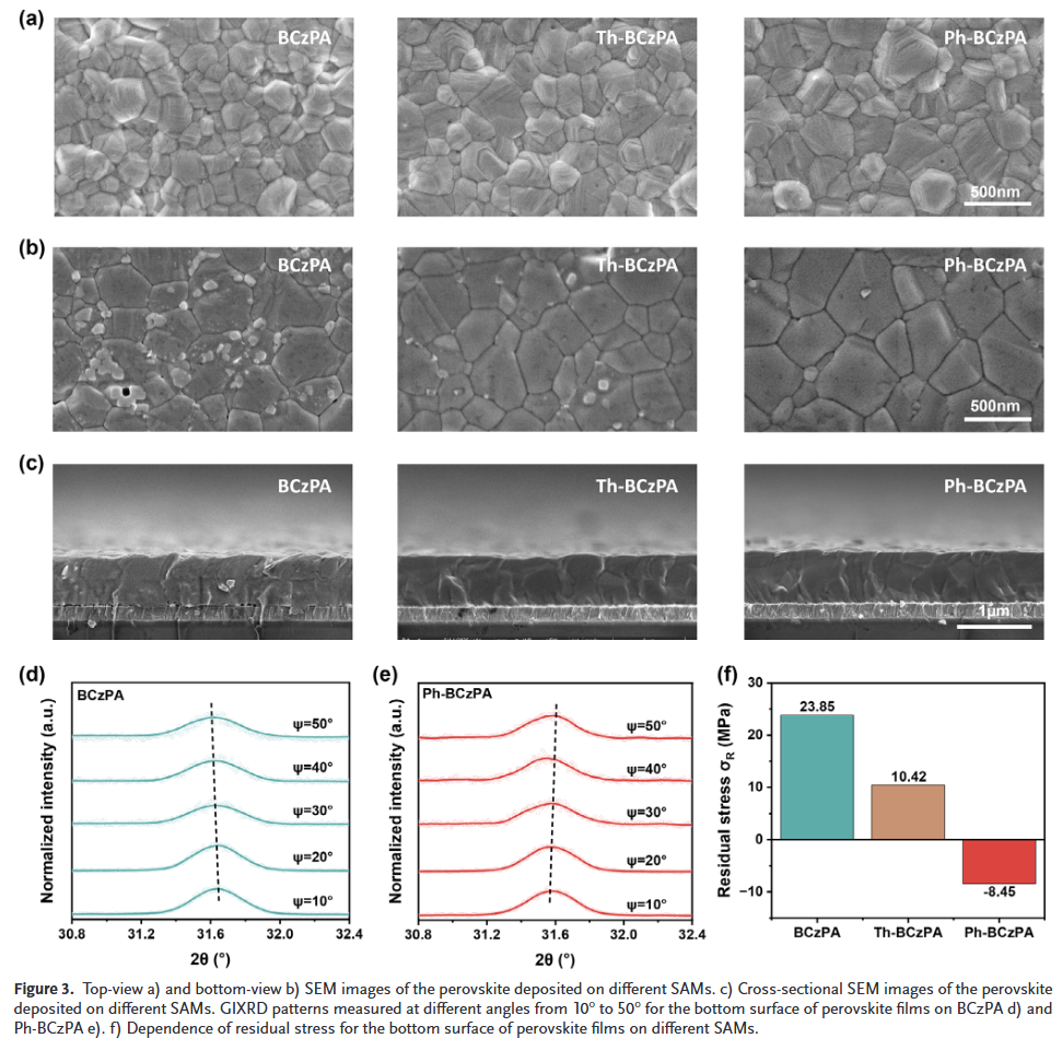- 界面能级优化与缺陷抑制:Ph-BC2PA修饰的ITO与钙钛矿层形成有利能级排列,促进空穴提取;同时提升钙钛矿结晶质量,释放残余应力,显著降低非辐射复合。