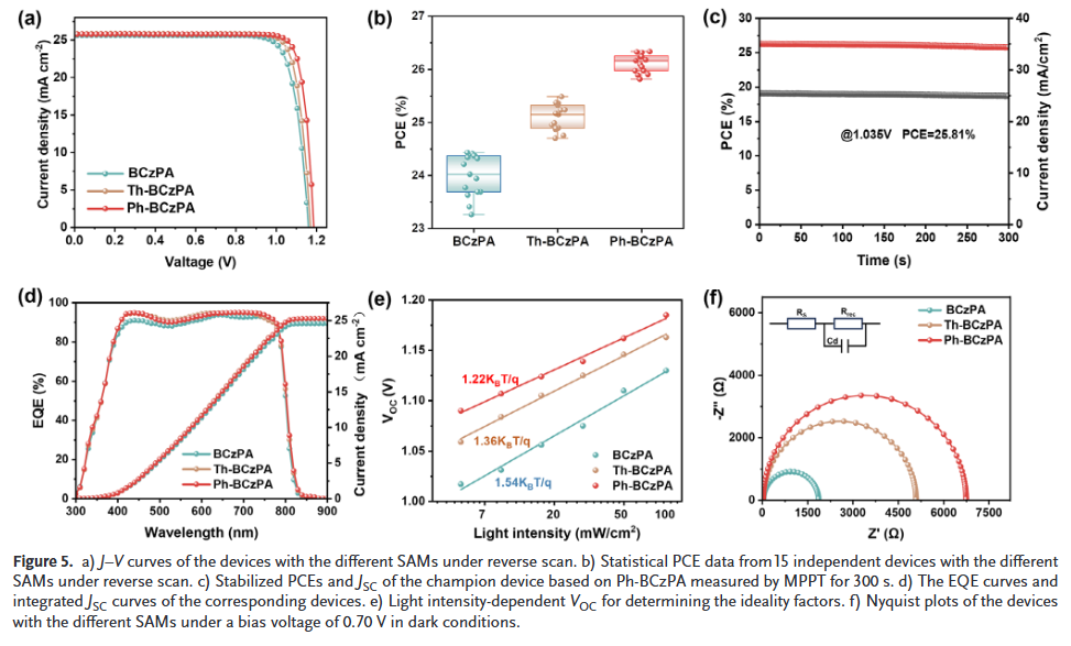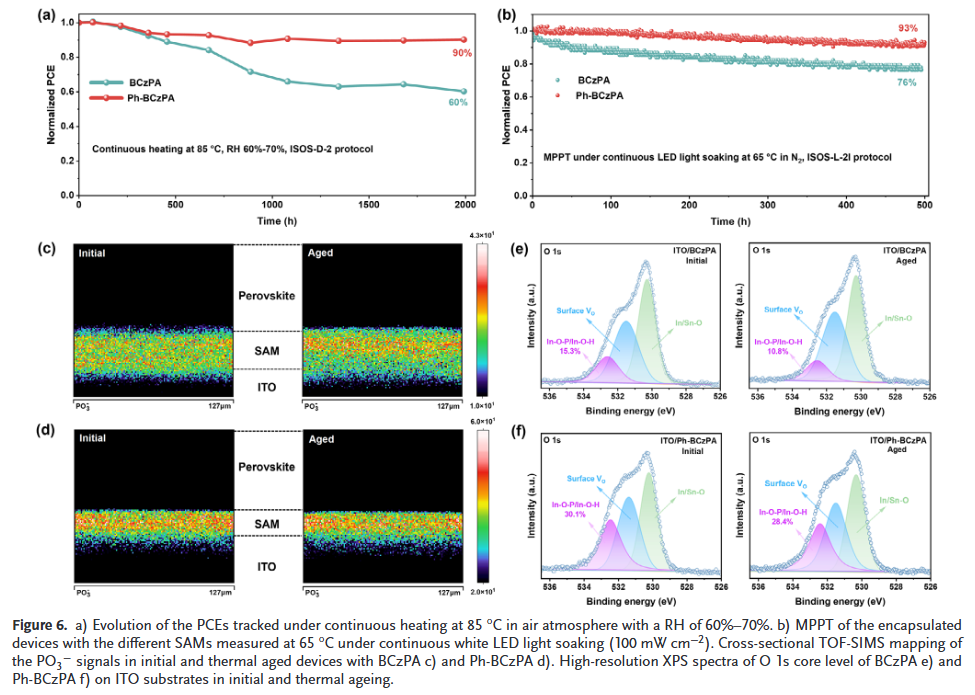 - 高效与高稳定性兼备:Ph-BC2PA器件效率达26.33%,并在65°C MPPT运行500小时后保持93%效率,85°C高温高湿老化2000小时后仍保持90%效率,稳定性表现突出。