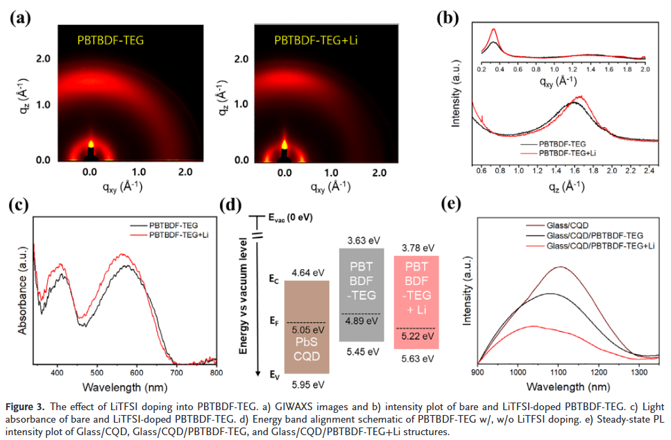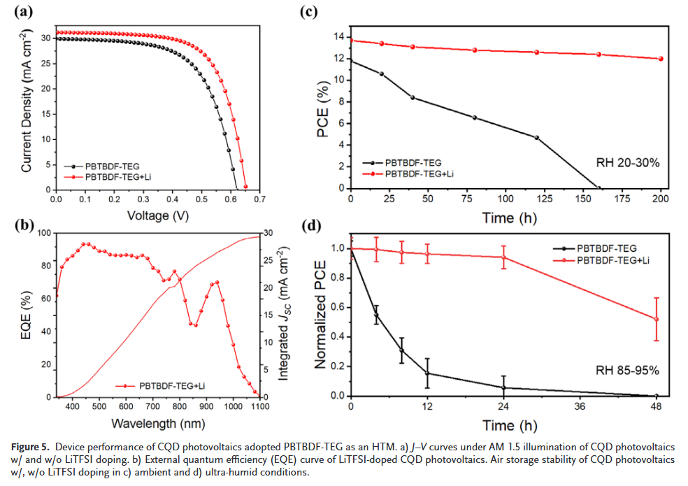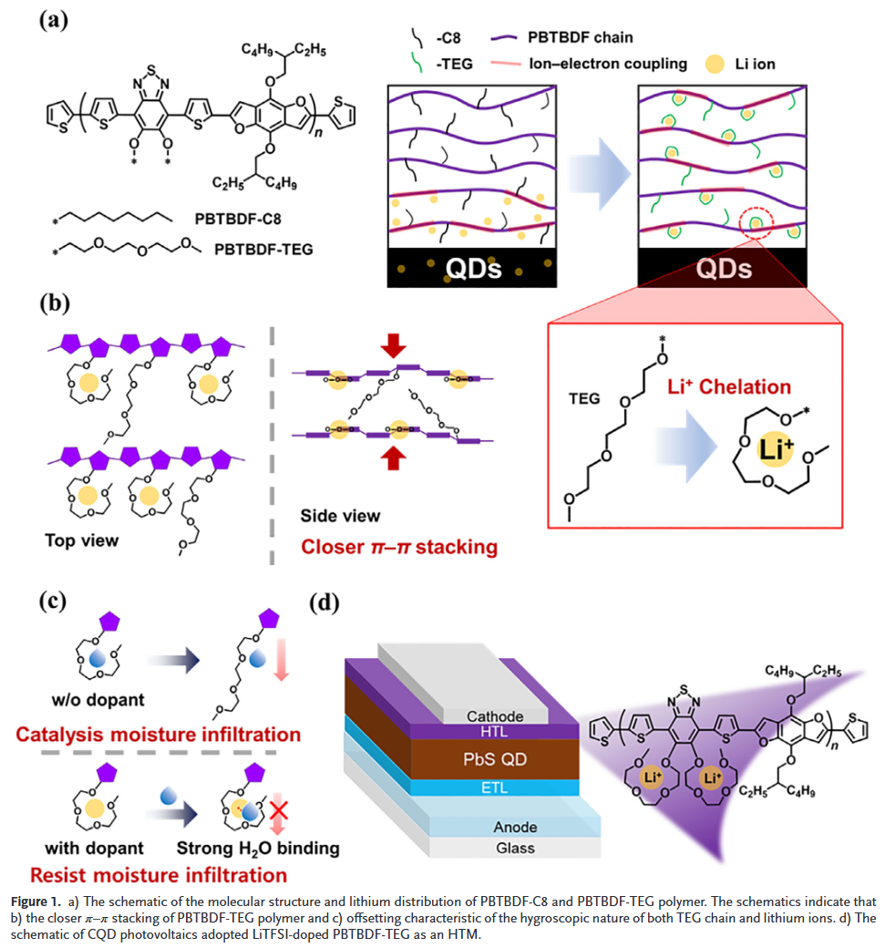 为解决这一问题,韩国科学技术研究院Byung Joon Moon、亚洲大学Junwoo Lee和大邱庆北科学技术院Jongmin Choi等人设计了一种离子-电子型共轭聚合物PBTBDF-TEC,该聚合物由苯并二呋喃和四乙二醇(TEC)取代的呋喃单元组成。PBTBDF-TEC通过TEC侧链对锂离子的螯合作用,有效限制了双(三氟甲磺酰基)酰亚胺锂(LiTFSI)掺杂剂的迁移。这种配位作用还减小了(010)π–π堆积距离,通过缓解空间位阻促进了空穴传输。因此,采用LiTFSI掺杂的PBTBDF-TEC的CQD太阳能电池实现了13.7%的功率转换效率(PCE),高于未掺杂器件的11.8%。此外,锂螯合作用固定了水分子,减缓了湿气侵入。