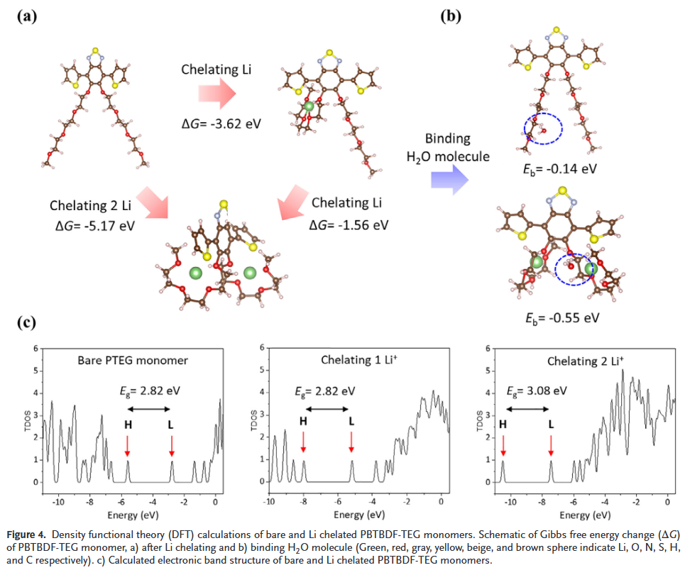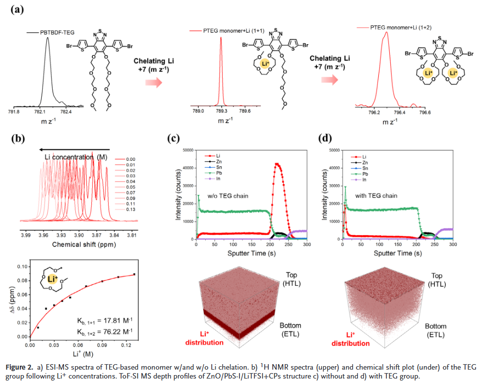- 掺杂剂螯合设计:新型共轭聚合物PBTBDF-TEG通过TEG侧链有效螯合LiTFSI中的Li⁺,抑制掺杂剂向光活性层扩散,提升器件稳定性。