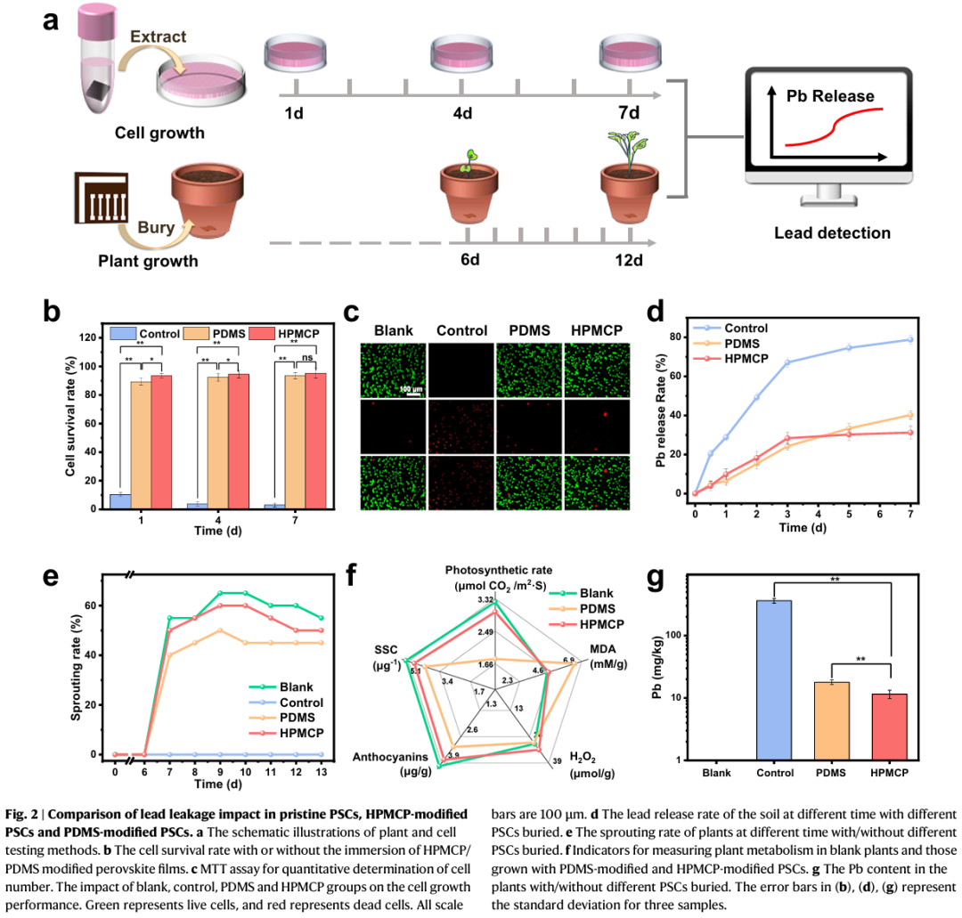 - 多维生态影响评估:首次系统结合细胞存活率与植物生长参数,全面评估PSCs铅泄漏对生态系统的实际风险,HPMCP组植物萌发率达92.3%,铅吸收量降低96.8%。