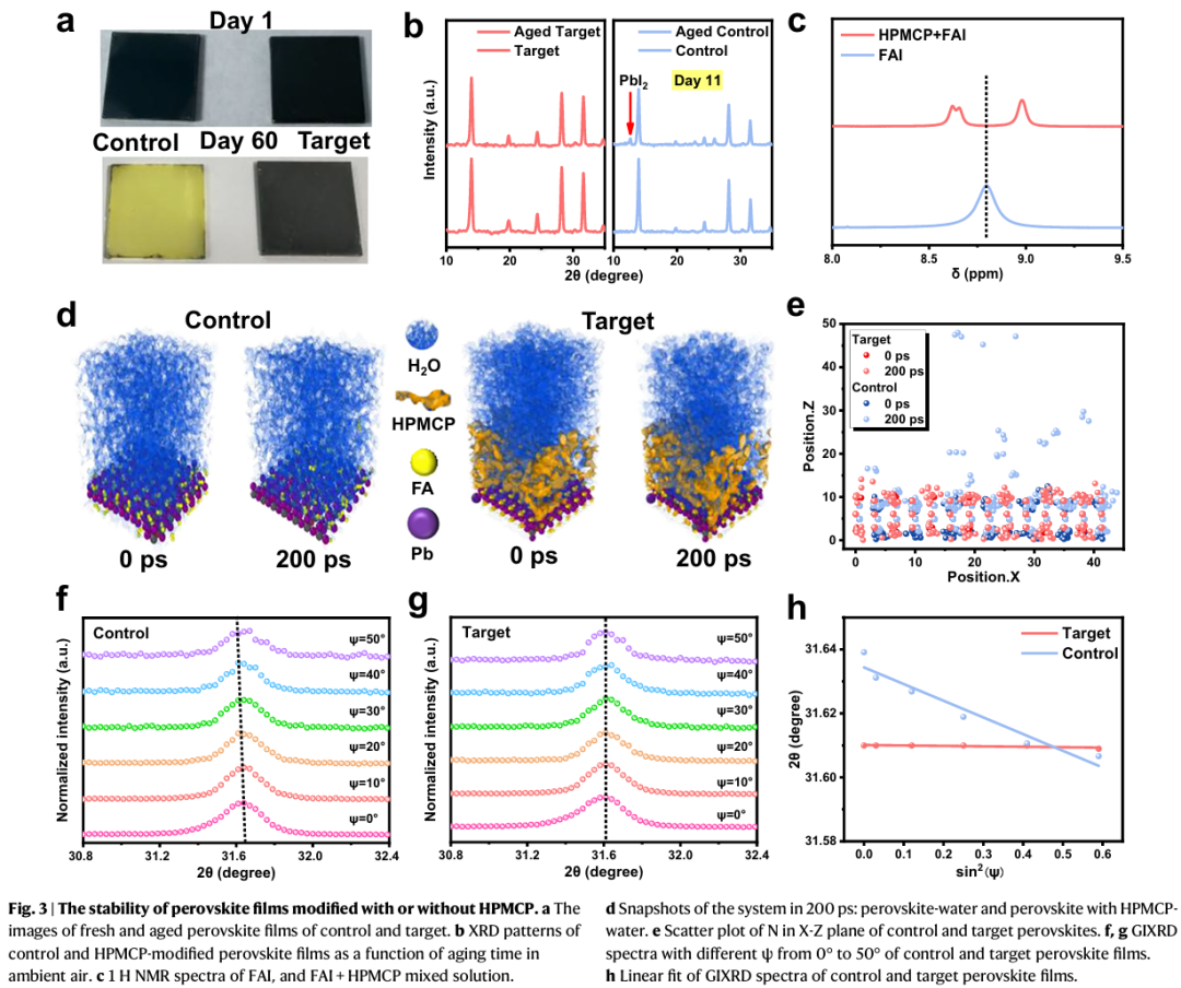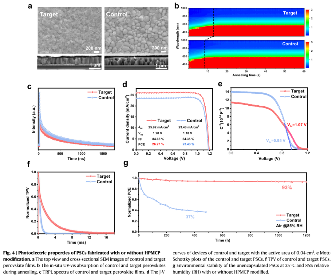 - 高效率与高稳定性兼具:HPMCP修饰的倒置PSCs实现26.27%的冠军效率,未封装器件在85%湿度下1200小时后仍保持93%的初始效率。