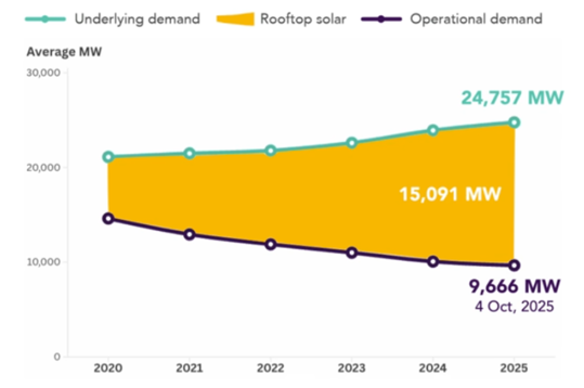 澳大利亚国家电力市场(NEM)于10月4日创下了9,666MW的最低运营需求新纪录,较2024年春季创下的纪录下降了4%。